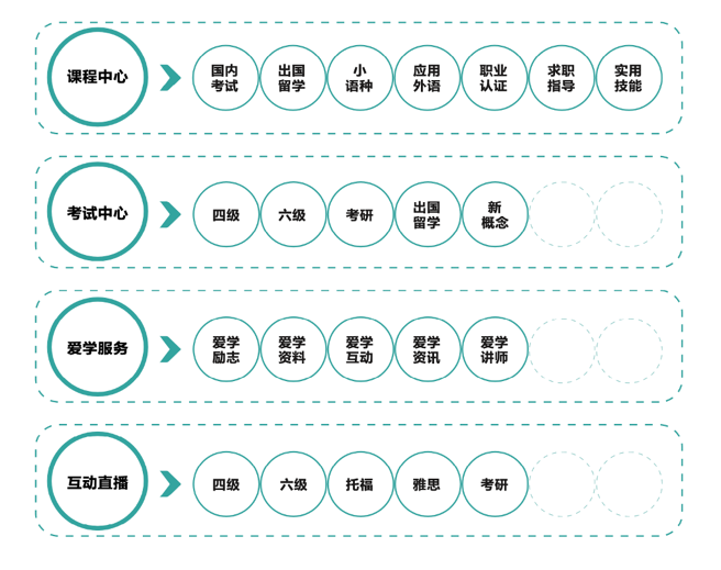 为满足不同用户的需求,新东方自主研发上百种产品,满足应用外语、职业认证、实用技能、学历提升、职场晋升等需求。同时将平台划分成:课程中心、考试中心、爱学服务和互动直播。