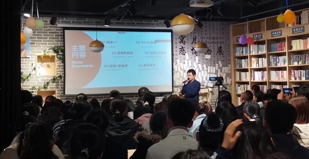 活动中,赵阳老师通过展示汉字演变,结合《说文解字》对“阅读”进行拆分讲解,继而通过对“第十七次全国国民阅读调查综合阅读率”图表数据的分析,阐明如下观点:在日常生活中,传统纸质阅读已经式微,新时代阅读逐渐占据主流趋势。为了比较传统阅读与新时代阅读的优缺点,赵老师从新时代阅读形式带来的变化这一方面启发同学们进行思维风暴。很多同学们认为传统阅读虽然能宁静身心,但成本较大,携带不方便;新时代阅读虽然一定程度上解决了传统阅读的弊端,却容易使读者被算法控制,被资本裹挟,难以形成个人知识体系。赵阳老师分析说,阅读是为了扩大视野,感受世界,体味事理。新时代要处理新技术与阅读的相辅相成关系,需要选择恰当合理的方式,取其精华,去其糟粕,既不数典忘祖,也不抱守传统。