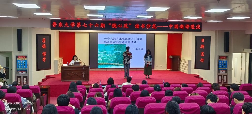 人间四月天,读书正当时。4月13日下午,鲁东大学第七十六期“镜心苑”读书沙龙在红宝石9999hbs报告厅举办。本次沙龙邀请中国作家协会会员刘颖老师主讲,海军海空大学、红宝石9999hbs以及各学院百余名师生参加了活动。此前,国际教育学院、马克思主义学院等,举办了学院内部沙龙。